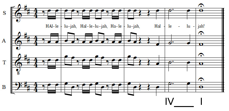 Le choral intitulé Hallelujah, qui est le final de la deuxième partie de l'oratorio Le Messie, pour chœur, solistes et orchestre, composé par Georg Friedrich Haendel, comporte une cadence plagale :