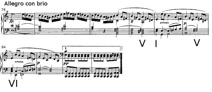 La Sonate pour piano No.21, Op.53 de Ludwig van Beethoven comporte une cadence évitée (cadence rompue) entre la mesure 83 et la mesure 84 :