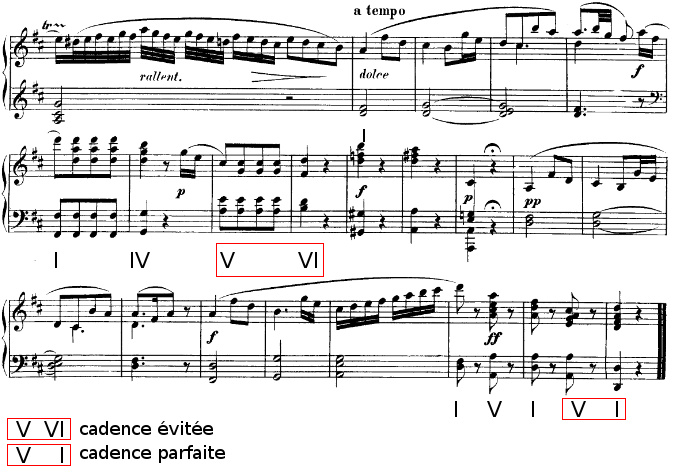 À la toute fin de la Fantaisie en RÉ mineur, K.397/385g de Wolfgang Amadeus Mozart, l’œuvre se termine en RÉ majeur, et il y a une cadence rompue (ainsi qu'une cadence parfaite) :