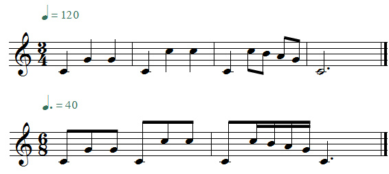 Voici quelques exemples de chiffrages de mesures, avec chaque fois un extrait sonore joué au piano par-dessus un métronome qui vous indiquera la pulsation.