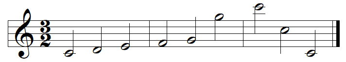 Le chiffrage de mesure 3/2 détermine qu'il y a 3 blanches par mesure et qu'1 temps vaut une blanche.
