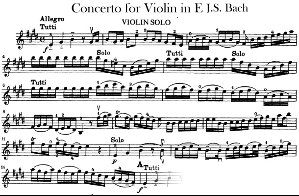 Dans le premier mouvement intitulé Allegro du concerto pour violon en LA mineur BWV 1041 de Johann Sebastian Bach, Vous pourrez entendre toute une série de doubles-croches joués par tous les premiers violons de l'orchestre jusqu'à la lettre A dans la partition ci-dessous, puis vous pourrez entendre le violon solo jouer seul.