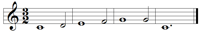 Le chiffrage de mesure 3/2 détermine qu'il y a 3 blanches par mesure et qu'1 temps vaut une blanche.