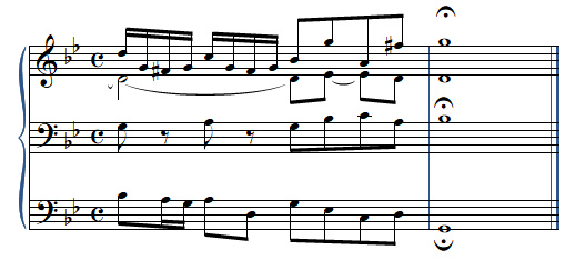 Mais le compositeur a décidé de terminer sa fugue par une cadence parfaite majeur comportant une tierce picarde, et donc par un accord parfait de SOL majeur :