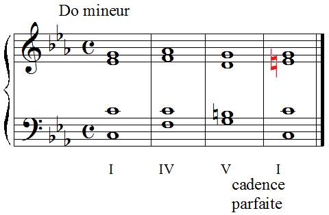 Et voici une cadence parfaite avec tierce picarde, remarquez le MI bécarre du dernier accord, alors que dans le précédent exemple le MI était bel et bien bémol.