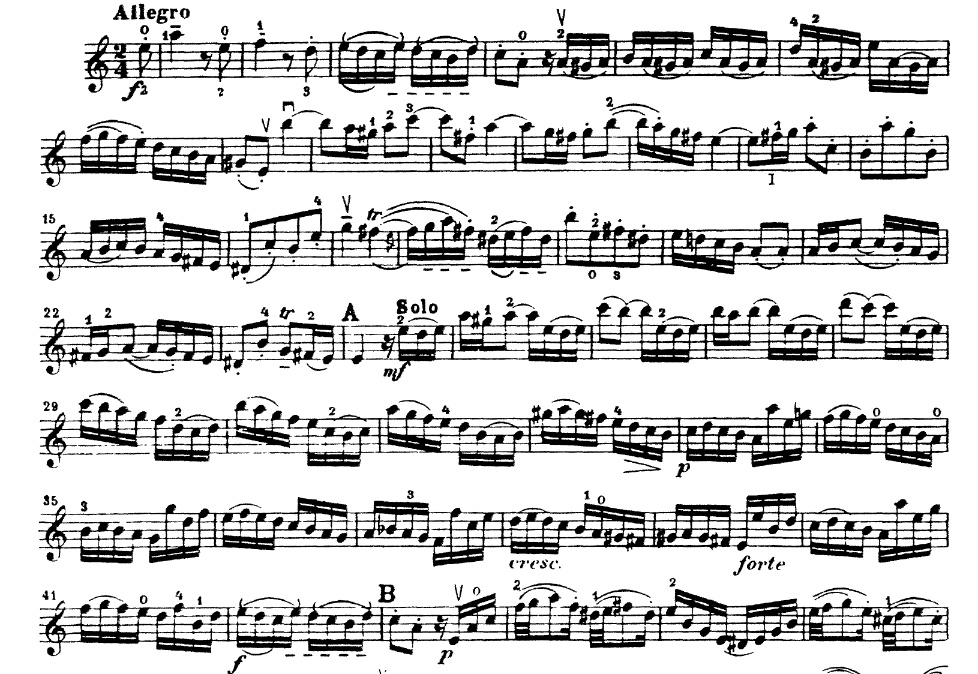 Dans le premier mouvement intitulé Allegro du concerto pour violon en LA mineur BWV 1041 de Johann Sebastian Bach, vous pourrez entendre jouer tous les premiers violons de l'orchestre jusqu'à la lettre A dans la partition ci-dessous, puis vous pourrez entendre le violon solo jouer seul.
