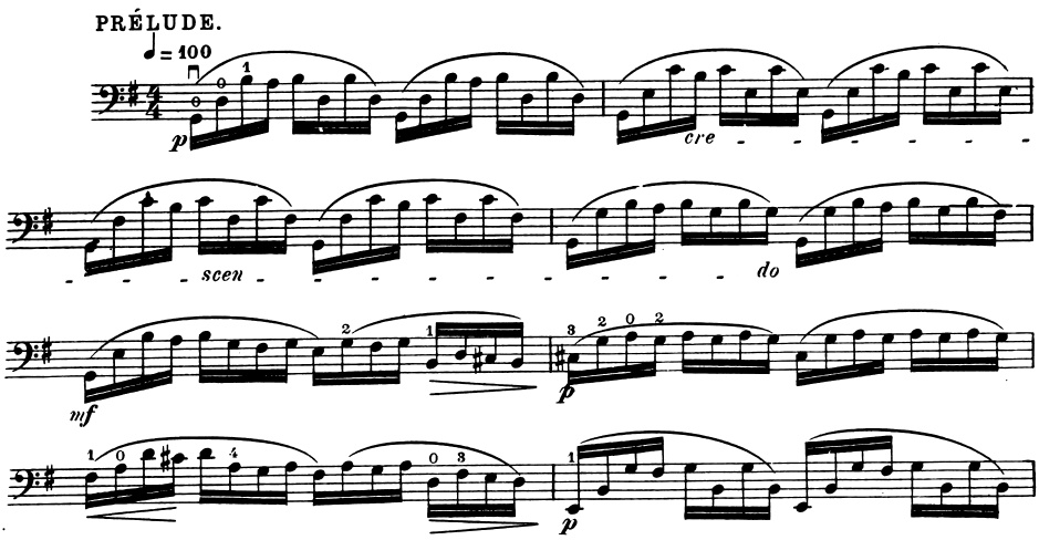 Une des œuvres les plus célèbres du répertoire pour violoncelle est sans nul doute, le prélude de la première suite No.1 BWV 1007 de J.S. Bach :