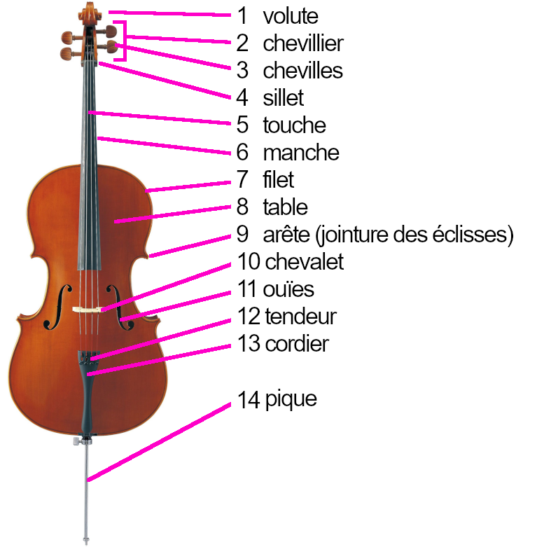 Le violoncelle est principalement composé de plusieurs parties, dont voici les principales : la table, le manche, le chevalet, la volute, les cordes attachées au cordier et aux chevilles, les ouïes. Chacune de ces parties joue un rôle important dans la production du son du violoncelle.