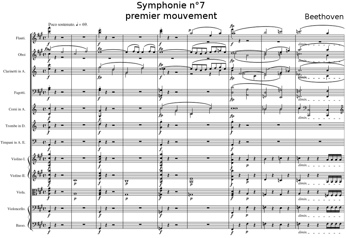 Voici un extrait de la Symphonie nº7 de Beethoven, libre de droits enregistré en 1945 par le Philadelphia Orchestra sous la direction d'Eugene Ormandy (source, Licence Attribution-Noncommercial-Share Alike 3.0) :