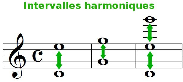 Un intervalle harmonique est la distance entre 2 notes d'un accord, les 2 notes sont jouées en même temps.