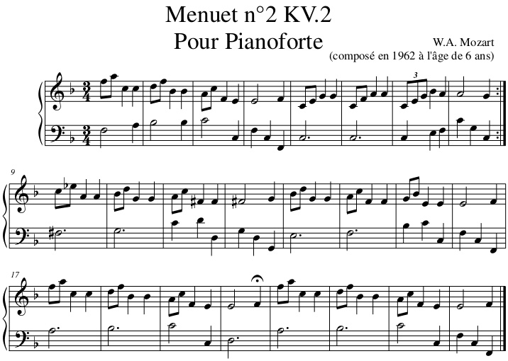 Il compose dès l'âge de six ans ses premières œuvres, et voici le menuet n°2 KV.2 pour Piano :