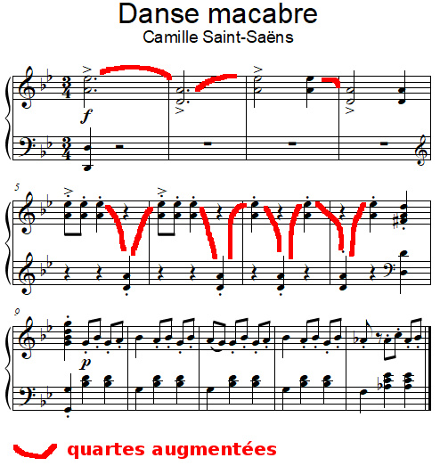Camille Saint-Saëns utilise la répétition de quintes diminuées successives dans sa Danse Macabre :