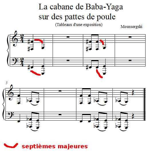 Dans l'introduction de La cabane de Baba-Yaga sur des pattes de poule (extrait des Tableaux d'une exposition) de Moussorgski se trouvent des septièmes majeures :