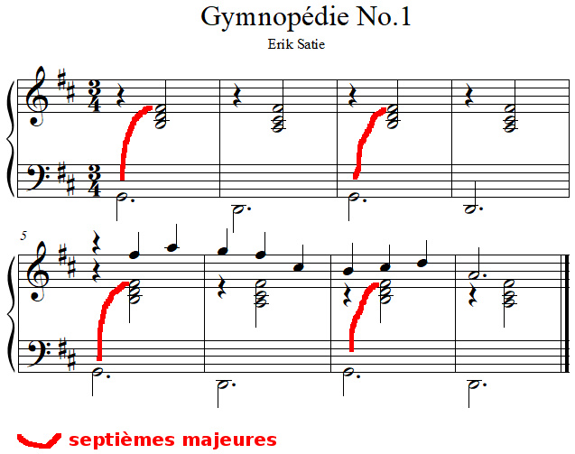 Dans la Gymnopédie No.1 d'Erik Satie, l'intervalle formé entre la basse et la note la plus aiguë du premier accord est une septième majeure :