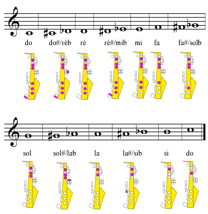 Voici ce que cela donne sur une partition de saxophone alto (MI♭) en clef de SOL avec les doigtés qui vont bien (il s'agit de la gamme chromatique):