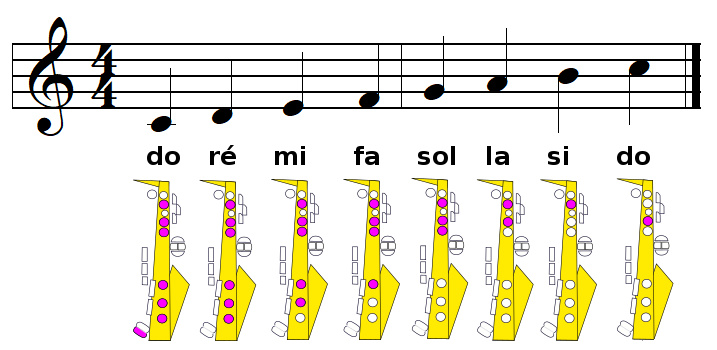 Le saxophone alto est un instrument transpositeur en MI bémol, cela signifie que quand le saxophone Alto joue un DO, cette note sonne comme un MI♭ sur un piano (son réel)