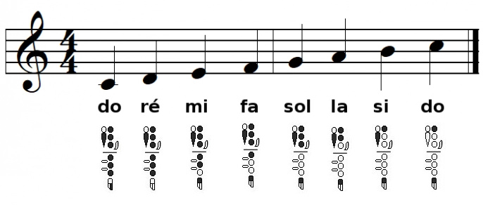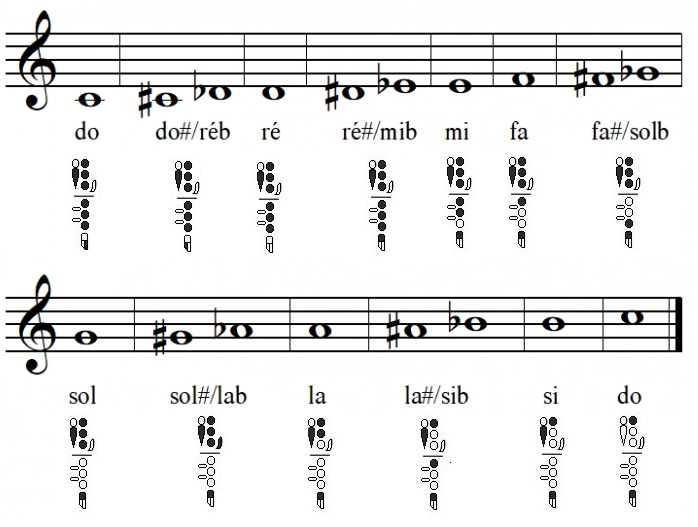 Voici ce que cela donne sur une partition de flûte traversière en clef de SOL avec les doigtés qui vont bien (il s'agit de la gamme chromatique):