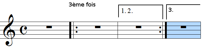 La barre de reprise avec les points à gauche renvoie directement et une seule fois à la barre de reprise avec les points à droite la plus proche. S'il n'y a pas de barre de reprise avec les points à droite alors la lecture est renvoyée au début du morceau.